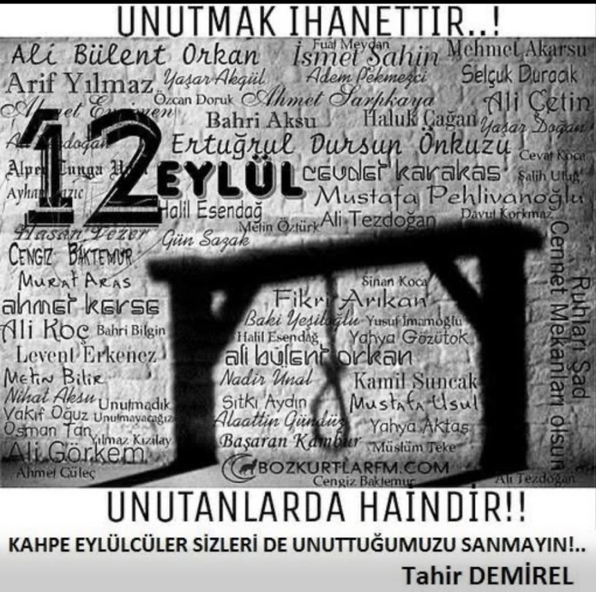 12 Eylül Türk Milletinin tarihine düşmüş kara bir lekedir. Yüreklerimize Eylül düşen bugünlerde; Vatanı uğruna mücadele edip gerek kızıl kurşunlarla, işkencelerde, darağaçlarında canları kaybeden şehitlerimizi ve mücadeleden sağ kurtulup gençlik yıllarını hapishanelerde harcayan Ülkücü büyüklerimi, başkanlarımı saygıyla anıyoruz.